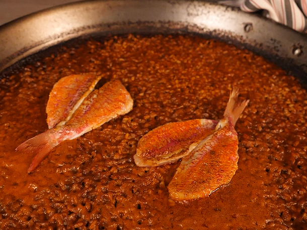 6. On a separate frying pan, mark the red mullets on the skin side and put them over the paella.