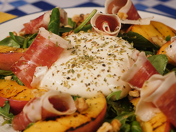 Sear the nectarines on the grill and add them to your burrata and ham salad to give it a touch of sweetness. Add Carmencita salt with truffle and oregano, and you will have a fresh, delicious salad.