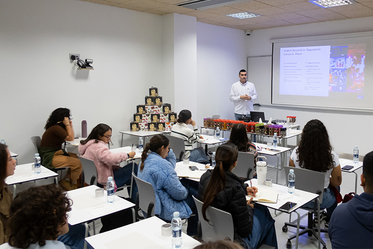 Después, nuestro compañero Aarón, experto en innovación sensorial, condujo una dinámica de análisis sensorial que invitó a los alumnos a explorar el papel de los cinco sentidos en la experiencia gastronómica.Descubrimos cómo cada uno de ellos interviene en la percepción de un plato y en la creación de emociones en el comensal. No se trataba solo de oler o probar, sino de comprender el sabor como un fenómeno complejo que une percepción, memoria y emoción.