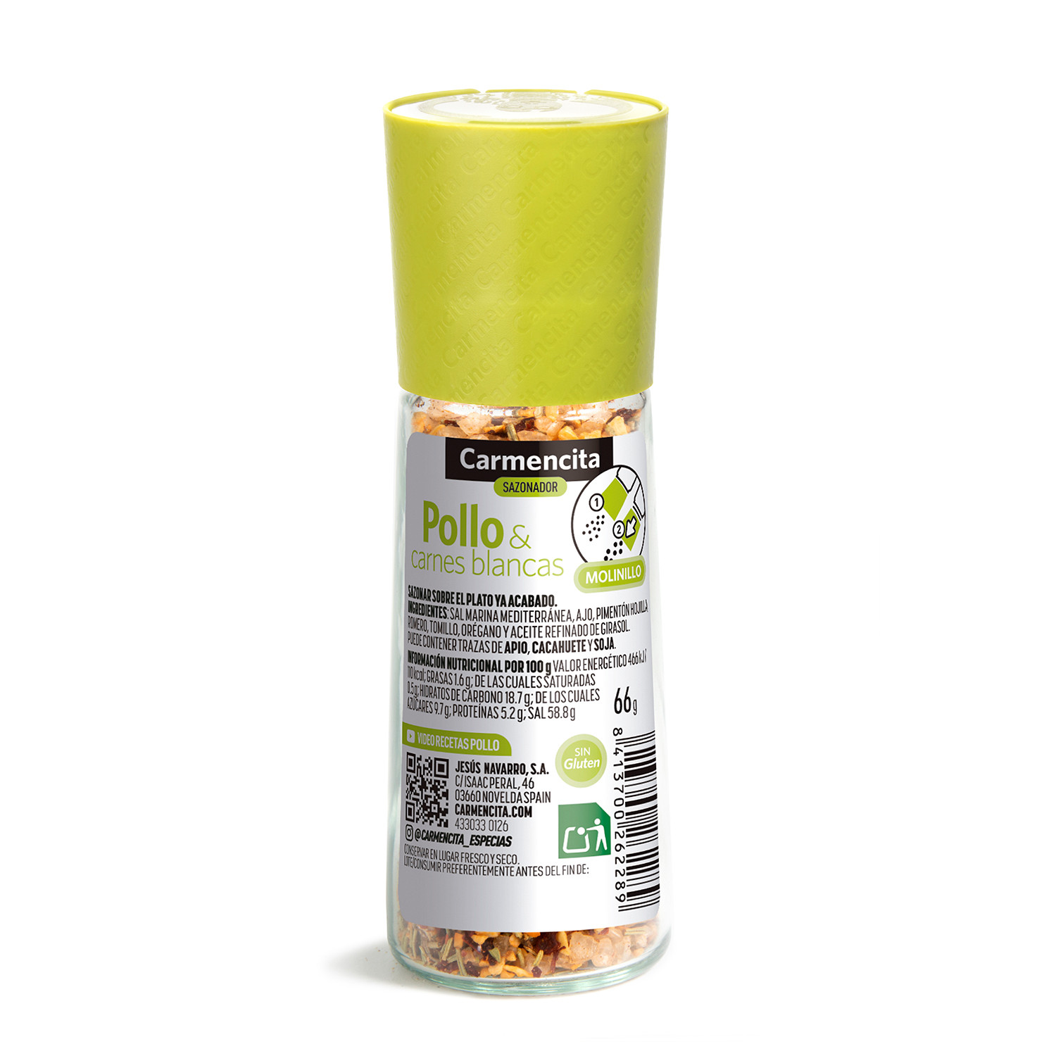 Ingredientes: sal marina mediterránea, ajo, pimentón hojilla, romero, tomillo, orégano y aceite refinado de girasol.