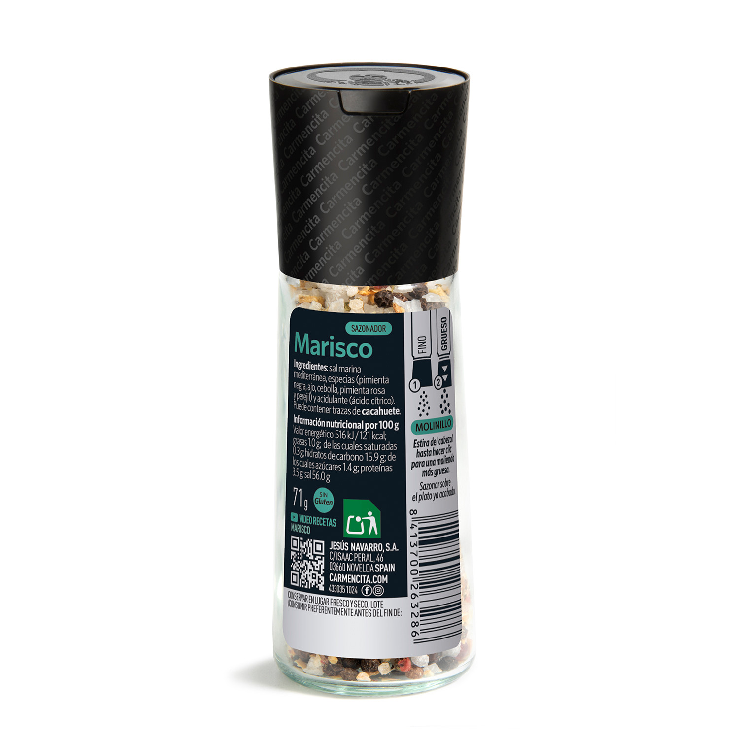 Ingredientes: sal marina mediterránea, especias (pimienta negra, ajo, cebolla, pimienta rosa y perejil) y acidulante (ácido cítrico).