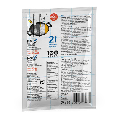 Ingredientes: especias (ajo, ñora, cebolla, pimentón, pimienta y azafrán), sal, aromas naturales (contienen crustáceos, pescado y extracto de marisco), azúcar, tomate y colorante (curcumina).