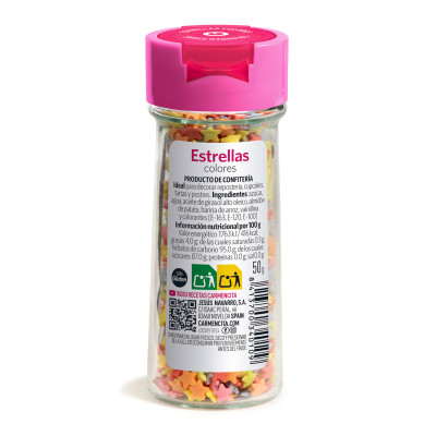 Ingredientes: azúcar, aceite refinado de girasol alto oleico, agua, almidón de patata, harina de arroz, vainilla y colorantes [E-163, E-120, E-100].