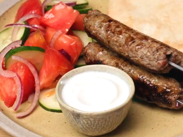 5. Cortar el pepino en rodajas, el tomate en gajos y la cebolla en juliana fina y mezclar las verduras en un bol junto con un chorrito de aceite de oliva y el zumo de medio limón. Servir la ensalada, el pan de pita caliente, los kofta recién hechos y la salsa para acompañar.